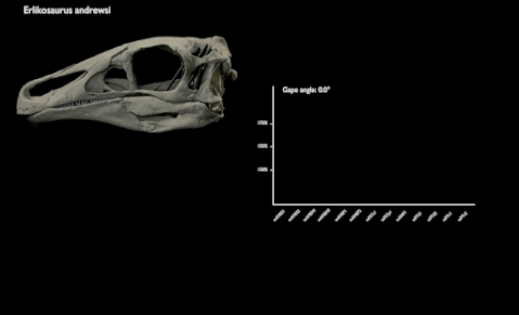 研究发现,肉食性的霸王龙和异特龙颌部张开程度较大,可张开接近90°。相比之下,草食性的安德鲁死神龙,颌部能张开的角度比较有限,只有45°左右。